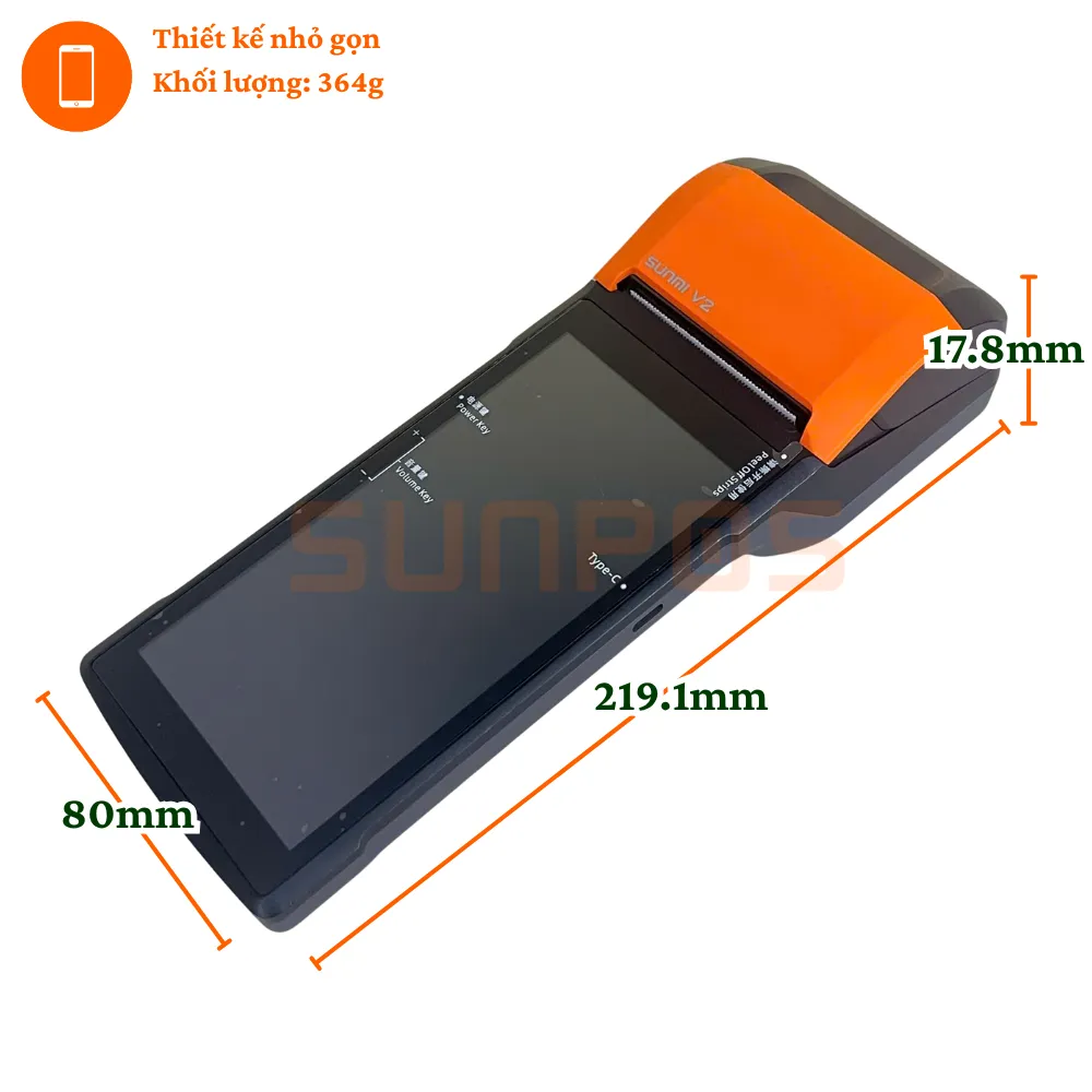 SUNMI V2 có thiết kế nhỏ gọn, trọng lượng nhẹ, dễ dàng mang theo mà không gây bất tiện, phù hợp với mọi không gian thu ngân.