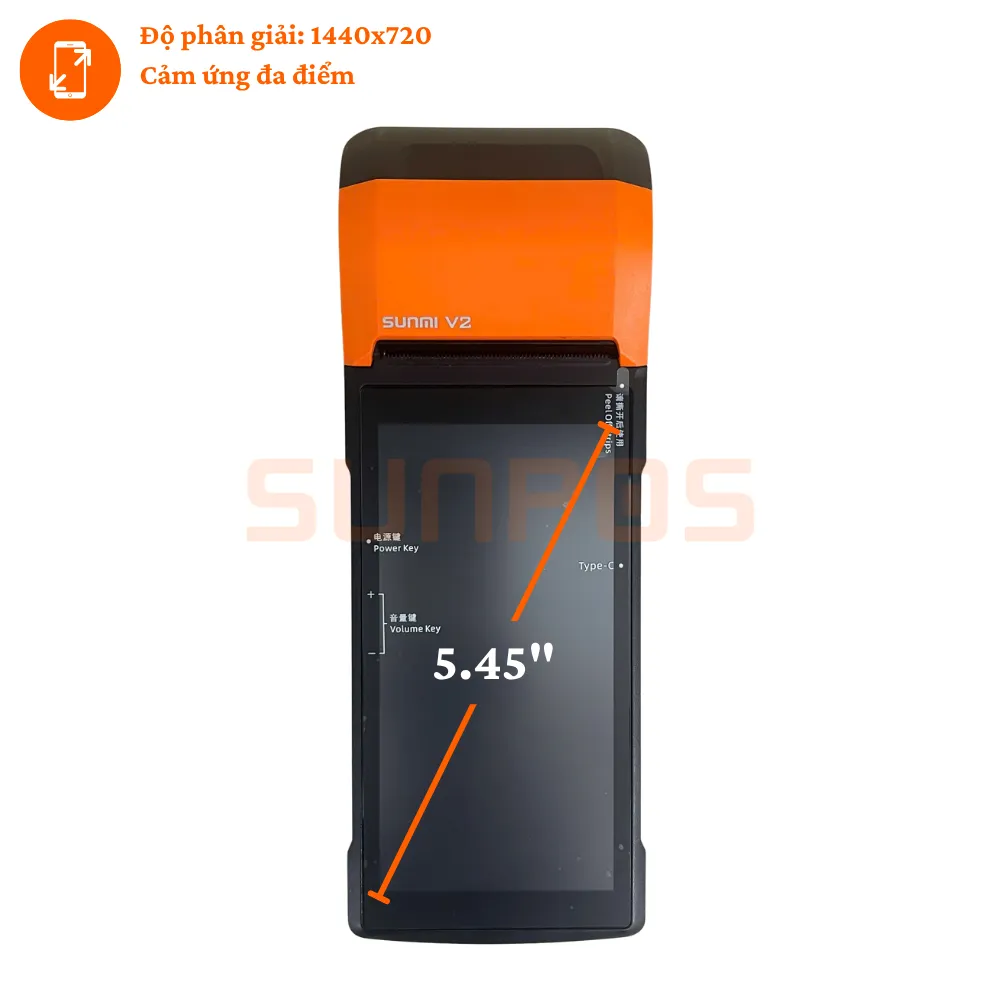 SUNMI V2 được trang bị màn hình độ phân giải HD+ 1440×720, hiển thị thông tin chi tiết, rõ ràng. Cảm ứng đa điểm giúp người dùng dễ dàng nhập liệu và thao tác trực tiếp trên màn hình mà không gặp bất kỳ khó khăn nào.