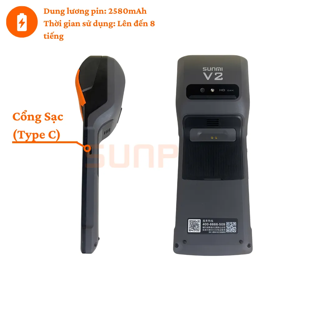 Sunmi V2 trang bị pin Li-Po chất lượng cao dung lượng 2580mAh (7.6V), cho phép sử dụng thoải mái cả ngày mà không ảnh hưởng đến tốc độ hay chất lượng in, ngay cả khi pin yếu. Ngoài ra, pin có cơ chế tự ngắt khi sạc đầy hoặc khi phát hiện pin tụt nhanh bất thường, giúp kéo dài tuổi thọ thiết bị.