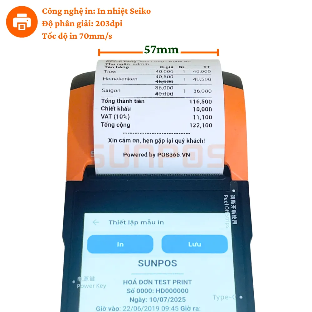 Máy được trang bị đầu in SEIKO với tốc độ 70mm/s và độ phân giải 203dpi, cho phép in hóa đơn nhanh chóng, sắc nét và rõ ràng.
